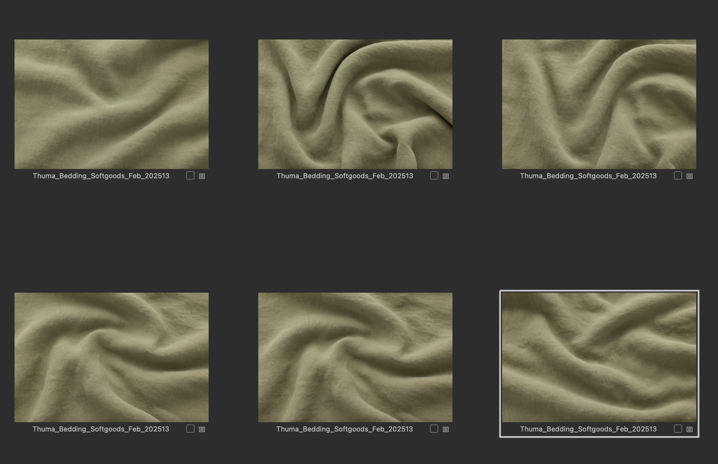Outtakes from texture shots of bedding PDP photography created for Thuma. Photographing soft goods is a good investment for high end brands who want customers to trust in their product authenticity. Nobody wants to invest in expensive new sheets based on an AI generated image.